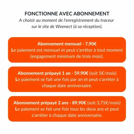 Abonnement requis : Le traceur obtient sa position GPS gru00e2ce u00e0 des satellites, puis l’envoie u00e0 nos serveurs gru00e2ce au ru00e9seau tu00e9lu00e9phonique. Il est u00e9quipu00e9 d’une carte SIM (incluse dans le produit), ce qui explique qu’il fonctionne avec abonnement. Cet abonnement se choisit au moment de l’enregistrement du traceur (u00e0 sa ru00e9ception) sur le site de Weenect.