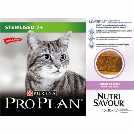 Les sachets repas Purina Proplan Cat Sterilised 7+ Nutrisavour Dinde en terrine aident u00e0 maintenir la bonne santu00e9 des voies urinaires chez les chats su00e9niors castru00e9s/stu00e9rilisu00e9s.