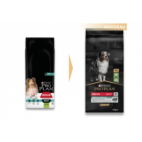 PURINA PRO PLAN Medium Adult Sensitive Digestion Riche en Agneau contient OPTIDIGESTu2122, une combinaison de nutriments avec des teneurs spu00e9cialement adaptu00e9es aux chiens adultes de taille moyenne ayant une digestion sensible. Si votre chien souffre du2019une digestion sensible, essayez ces croquettes et aidez-le u00e0 soutenir sa bonne santu00e9 globale.
