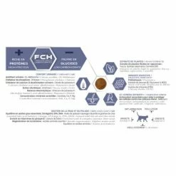 n Viandes et sous-produits animaux, poissons et sous-produits de poisson, c&eacute;r&eacute;ales, sous-produits d'origine v&eacute;g&eacute;tale, substances min&eacute;rales, sucres, huiles et graisses. Sources de prot&eacute;ines : poulet, porc, saumon.n